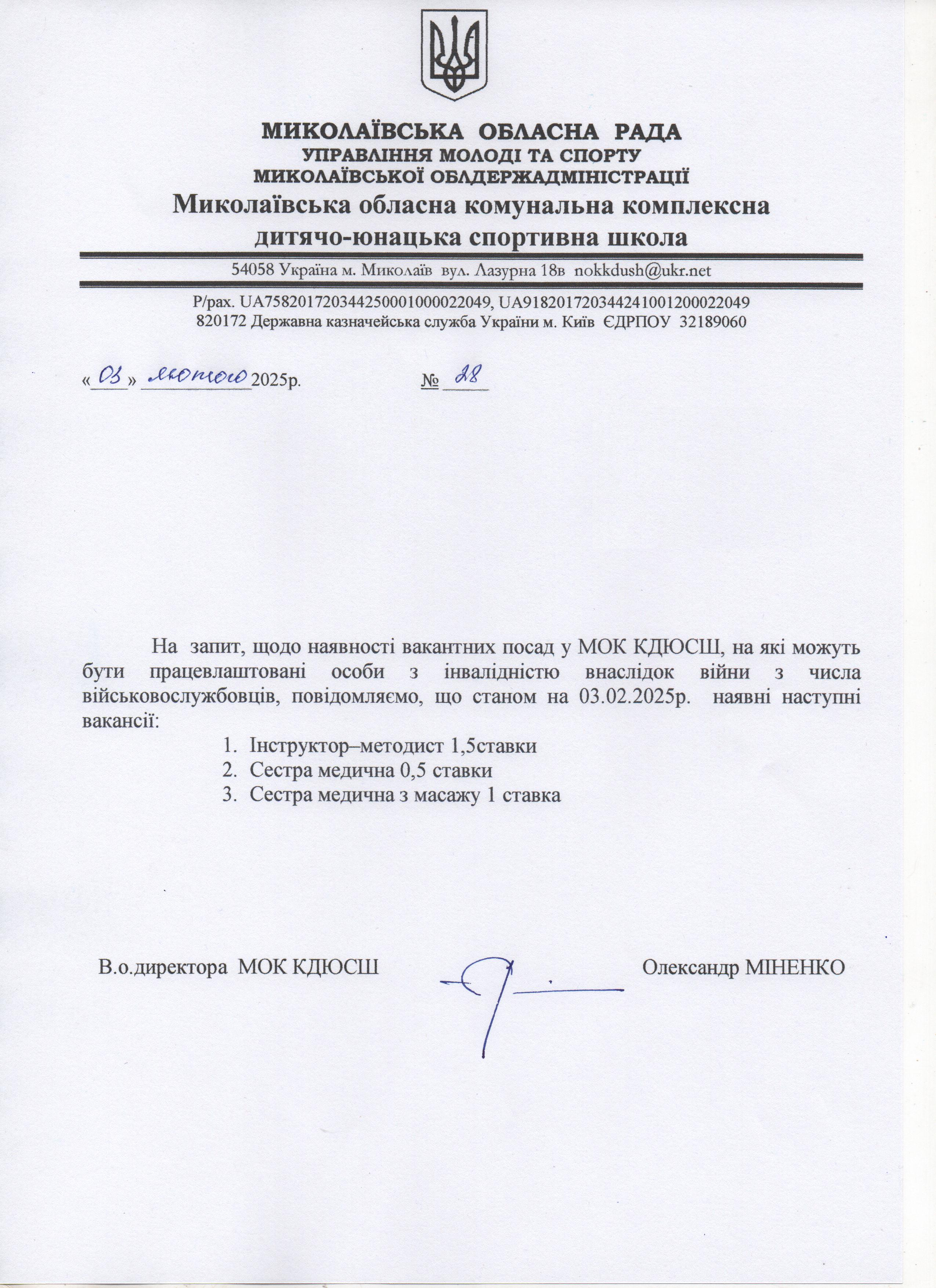 Відомості про вакантні посади, наявні у Миколаївській обласній державній адміністрації її структурних підрозділах, а також підпорядкованих підприємствах, установах та організаціях, на які можуть бути працевлаштовані особи з інвалідністю внаслідок війни з числа військовослужбовців