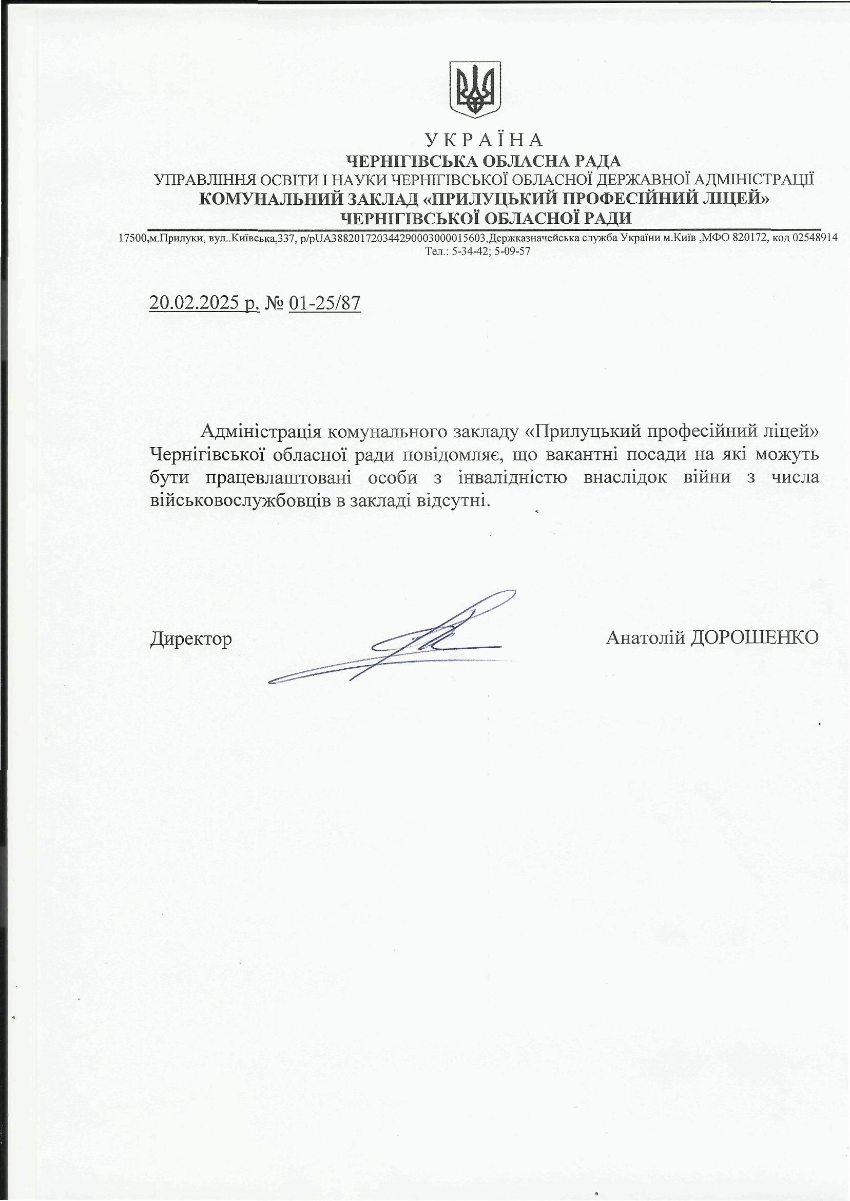 Адміністрація ЧПЛЗТ повідомляє про те що, наразі не має вільних вакантних