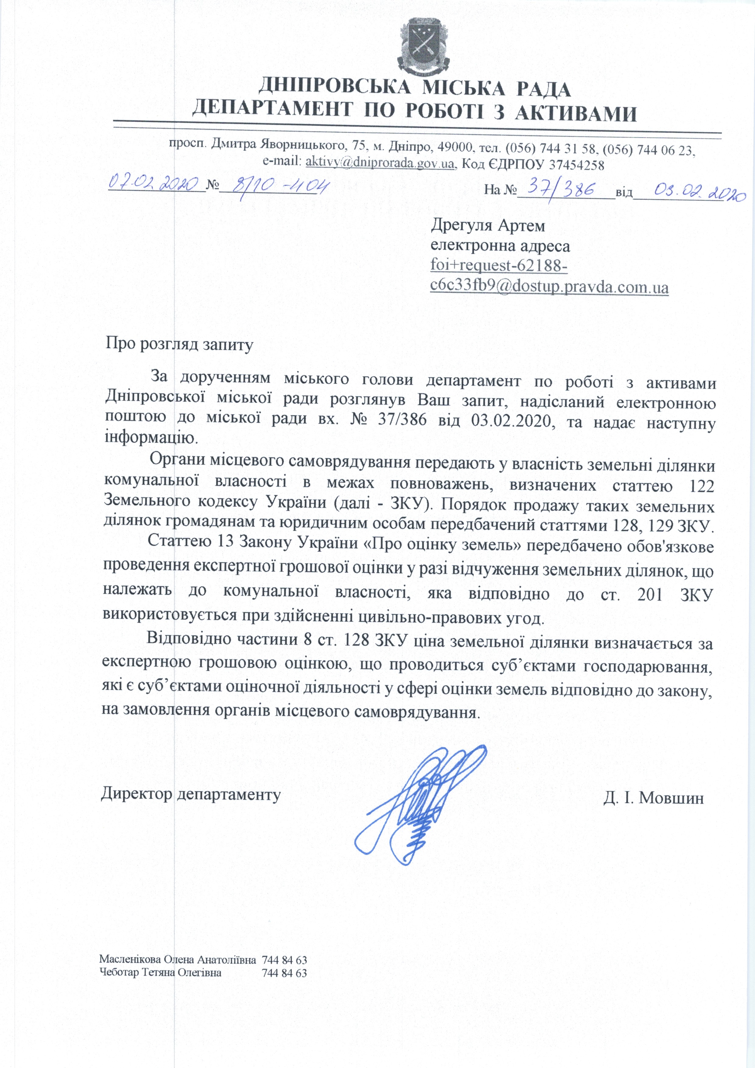 - щодо вартості викупної коммунальної землі в м. Дніпро.