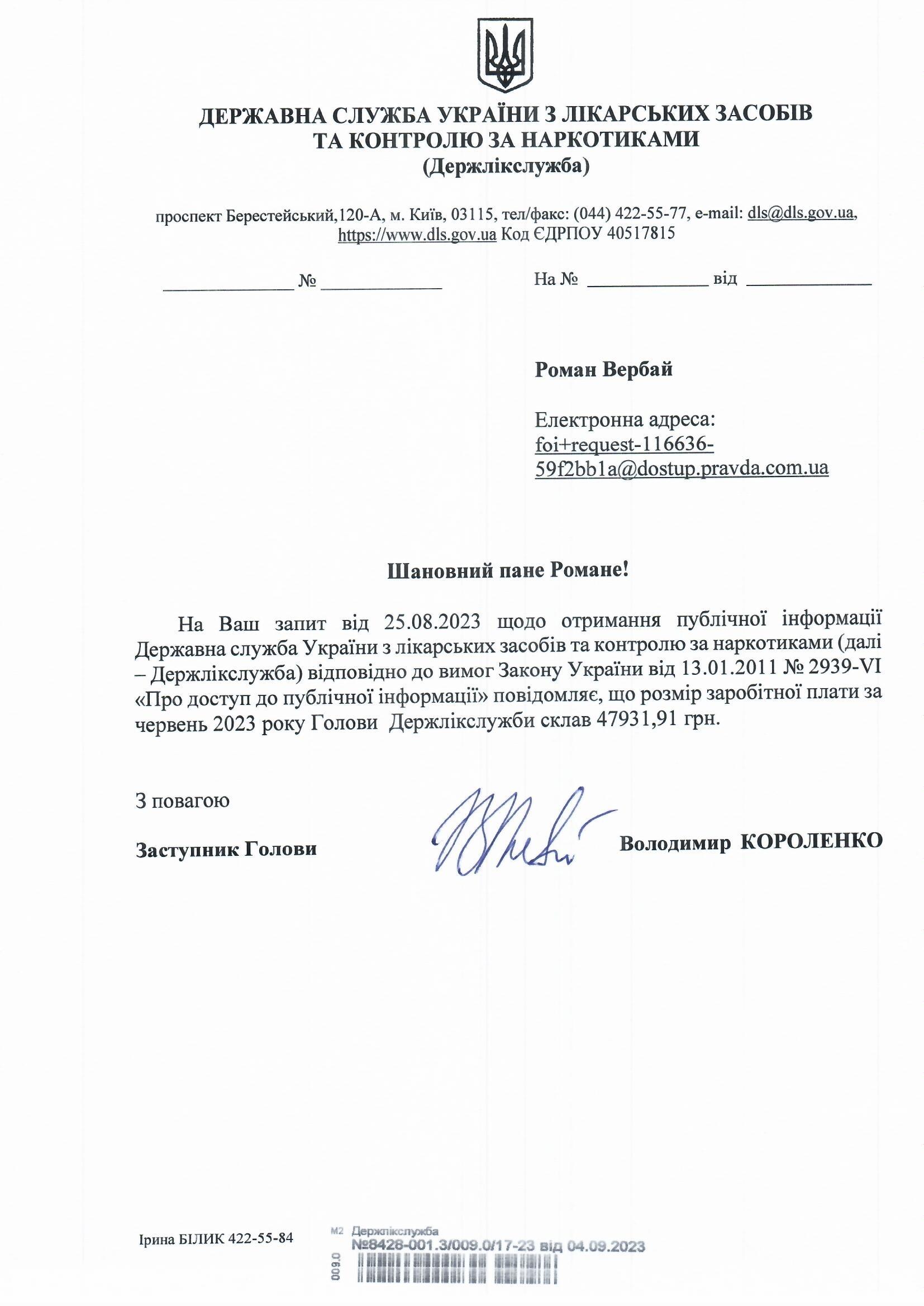 розмір заробітної плати за червень 2023 року Голови Державної служби України з лікарських засобів та контролю за наркотиками