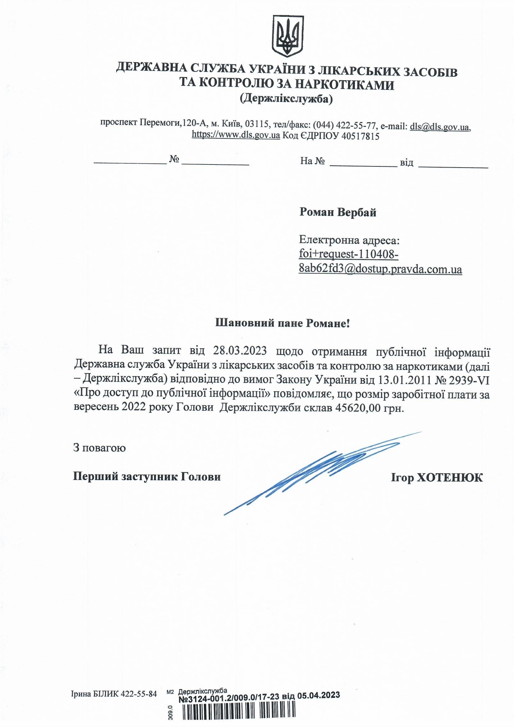 розмір заробітної плати за вересень 2022 року Голови Державної служби України з лікарських засобів та контролю за наркотиками