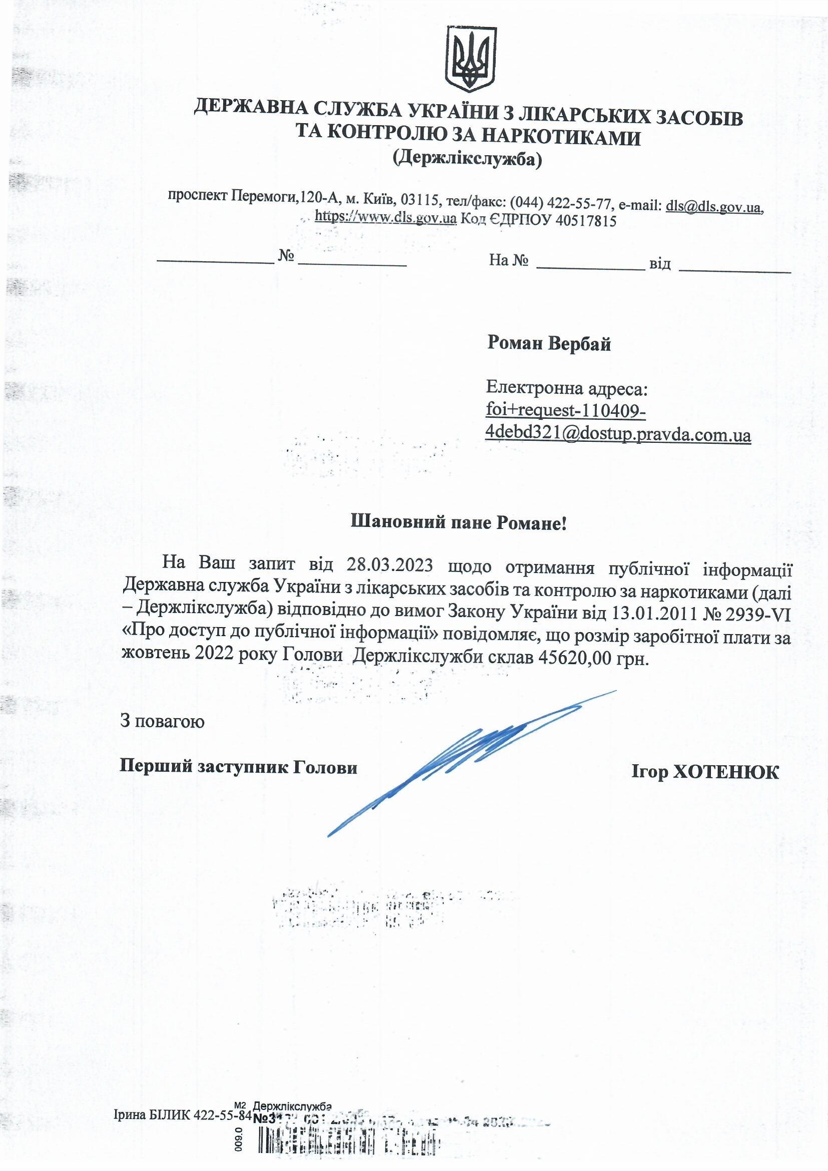 розмір заробітної плати за жовтень 2022 року Голови Державної служби України з лікарських засобів та контролю за наркотиками