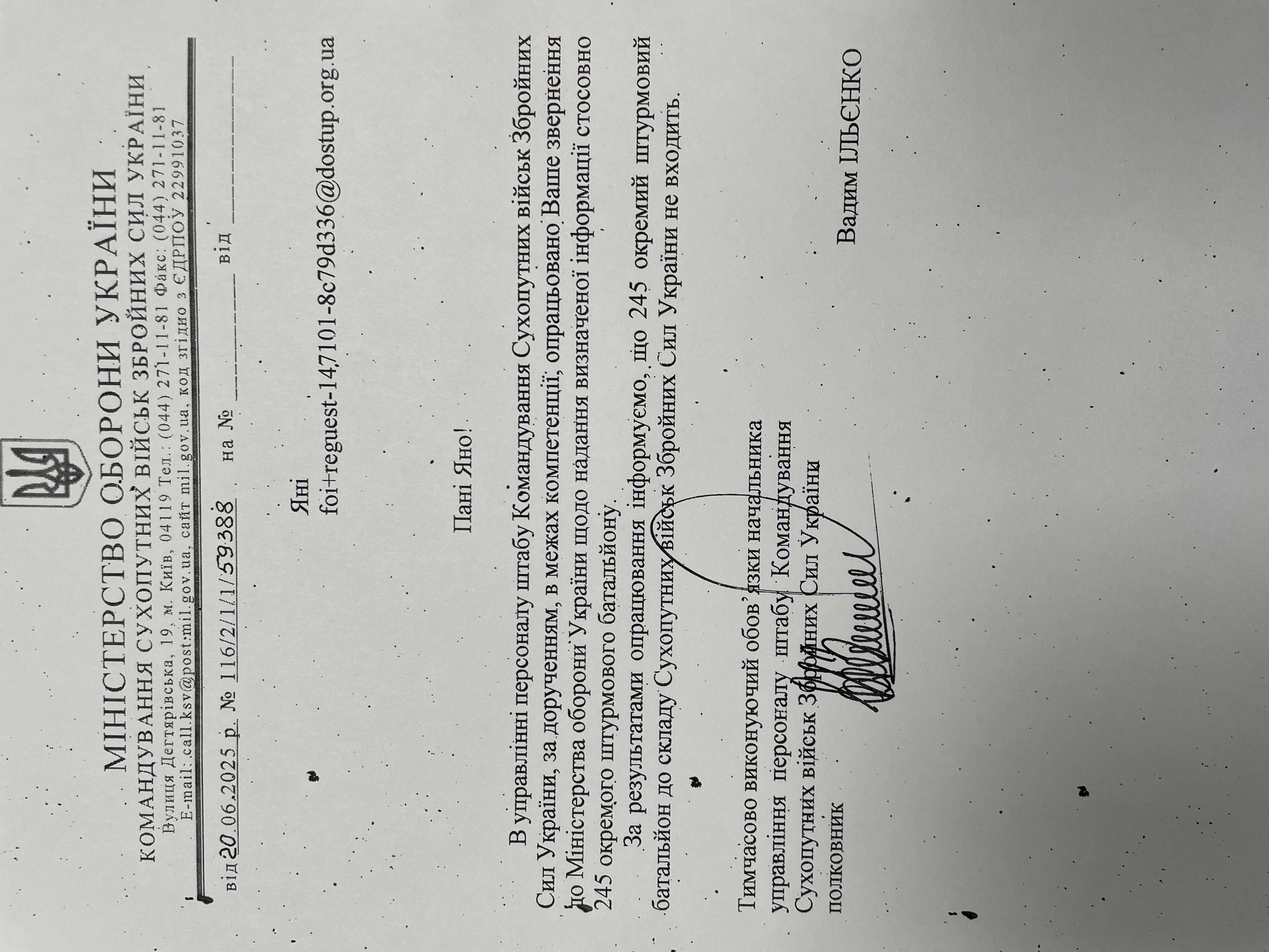 Код ЄДРПОУ, поштову адресу для листування та адресу електронної пошти в/ч 245 окремого штурмового батальйону