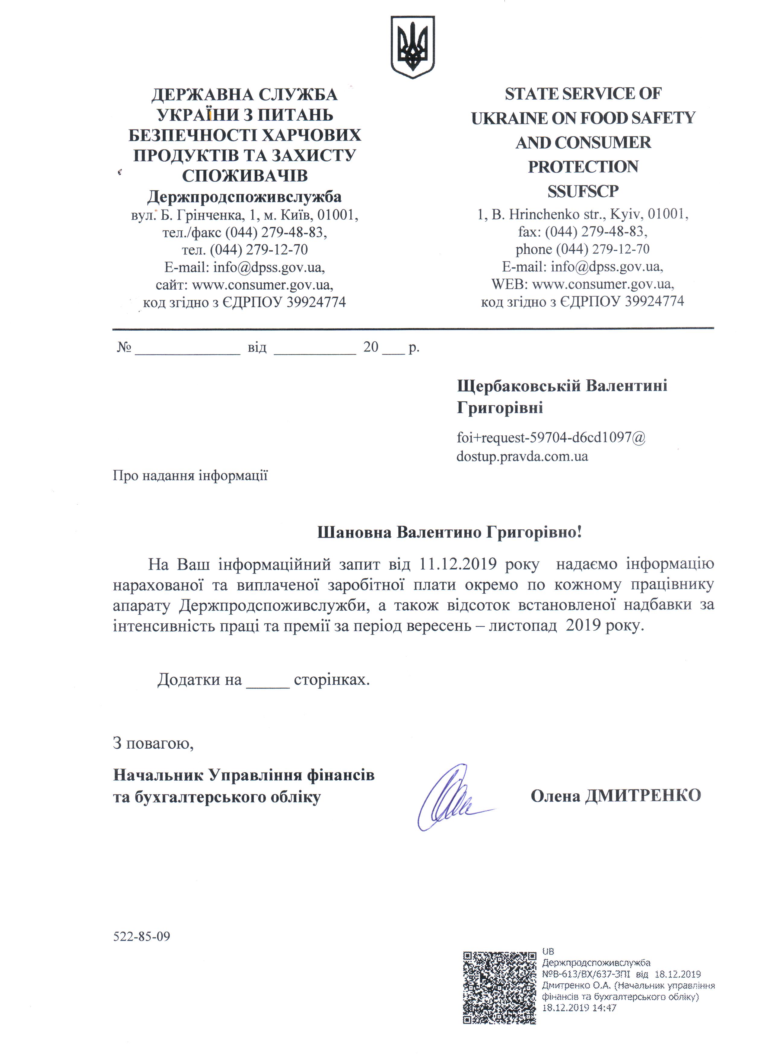 1. Нарахована та виплачена заробітна плата усіх працівників центрального апарату Держпродспоживслужби за вересень, жовтень, листопад 2019 року окремо по кожному працівнику.