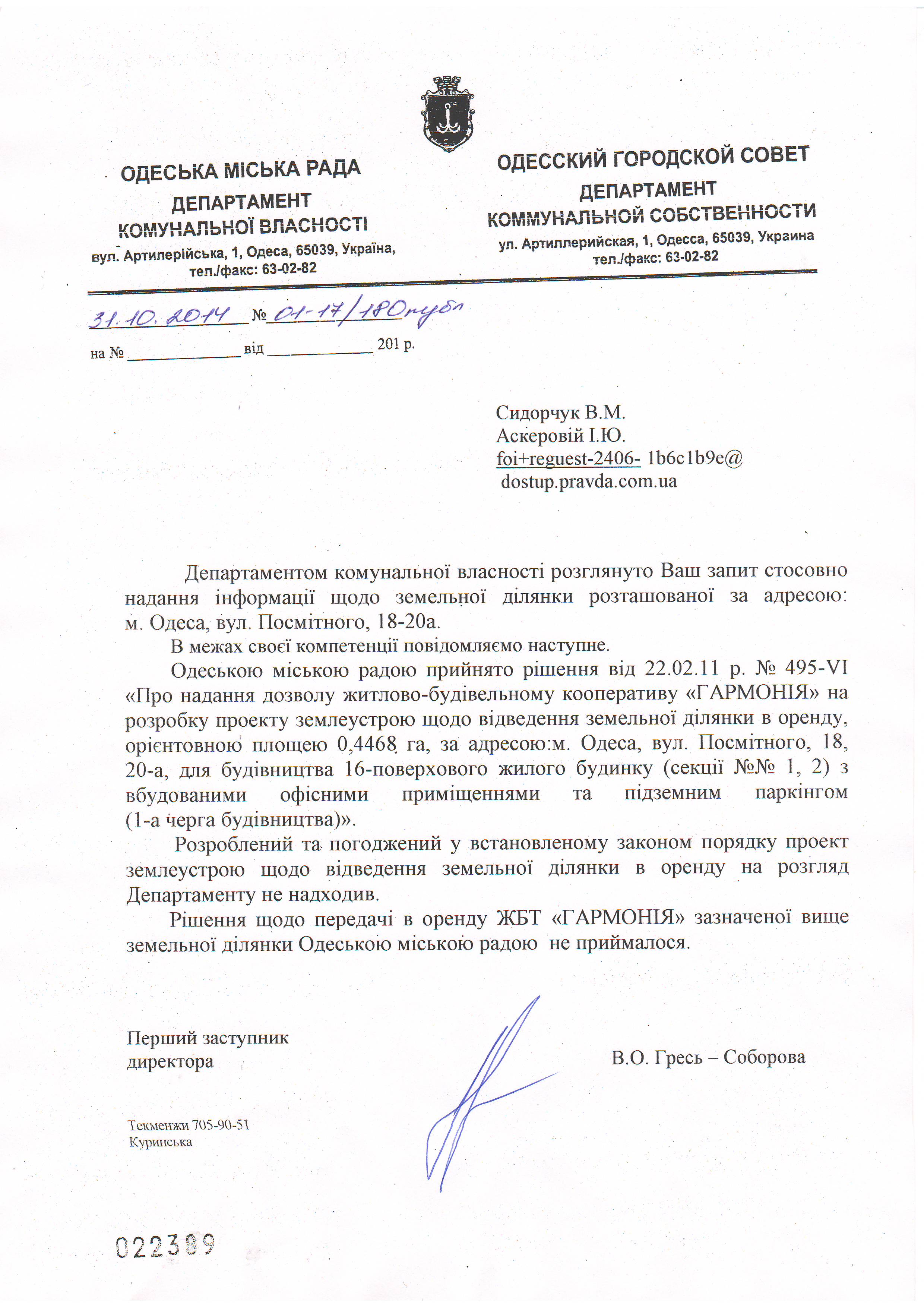 "Гармонія" земельною ділянкою за адресою м. Одеса, вул. Посмітного
