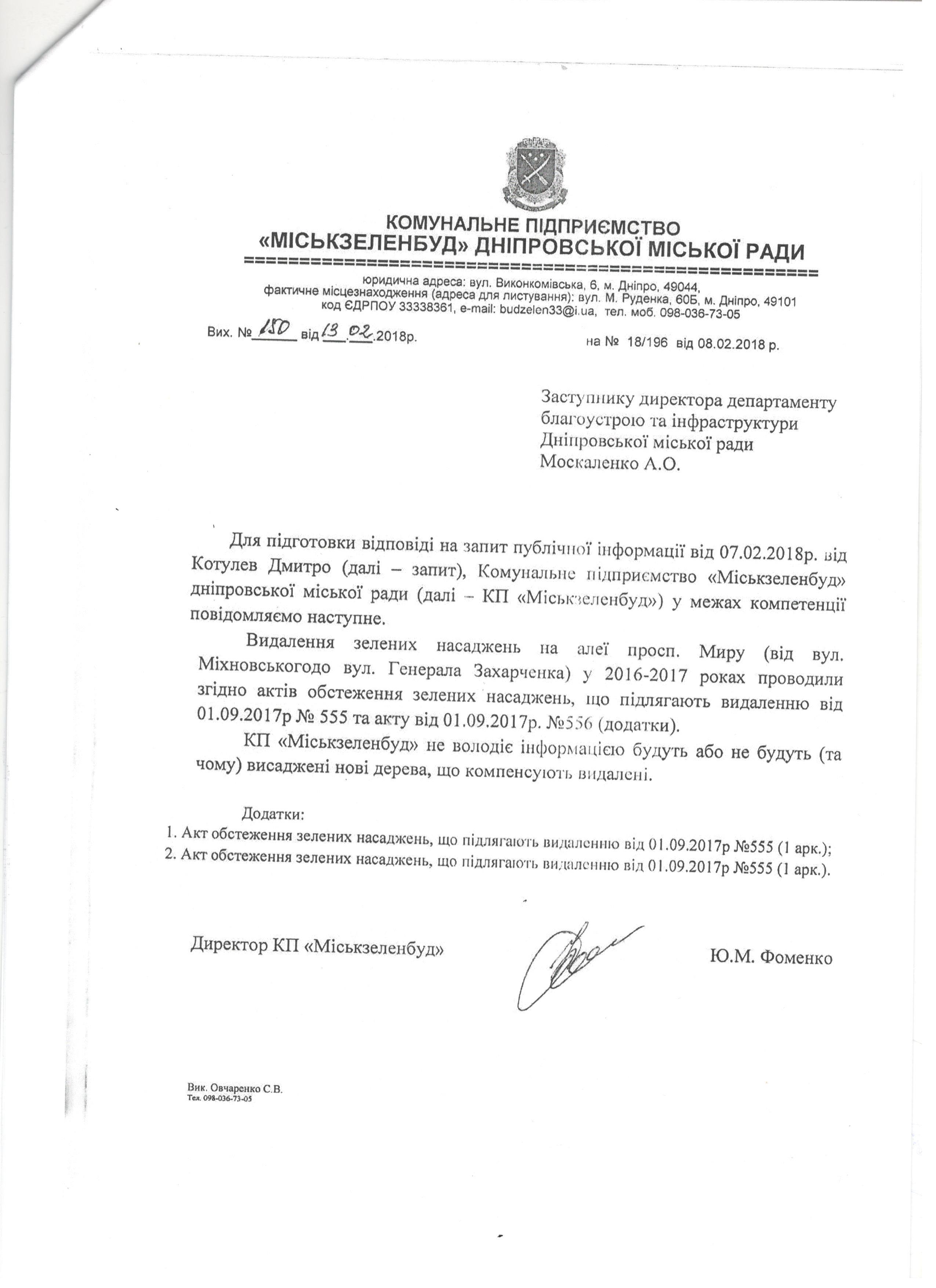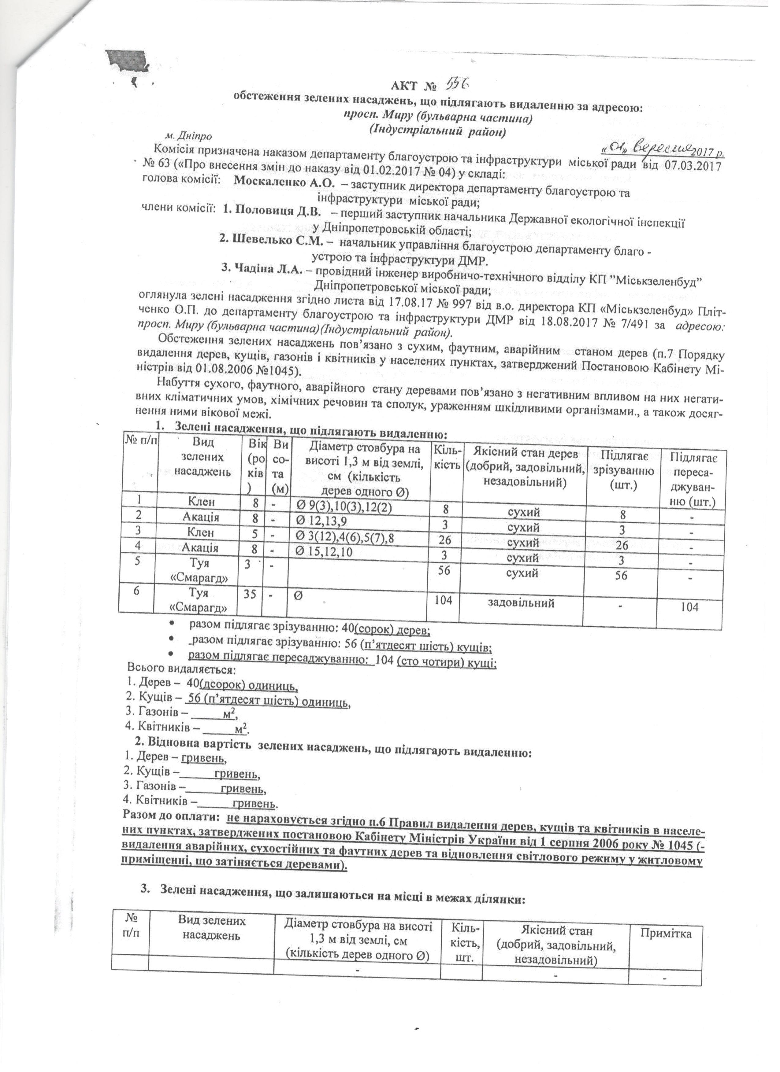 1. Були видалені зелені насадження на алеї пр.Миру(від вул. Міхновського до вул. Ген.Захарченка) у 2016-2017 роках з вказанням типу, стану дерев, їх кількості.