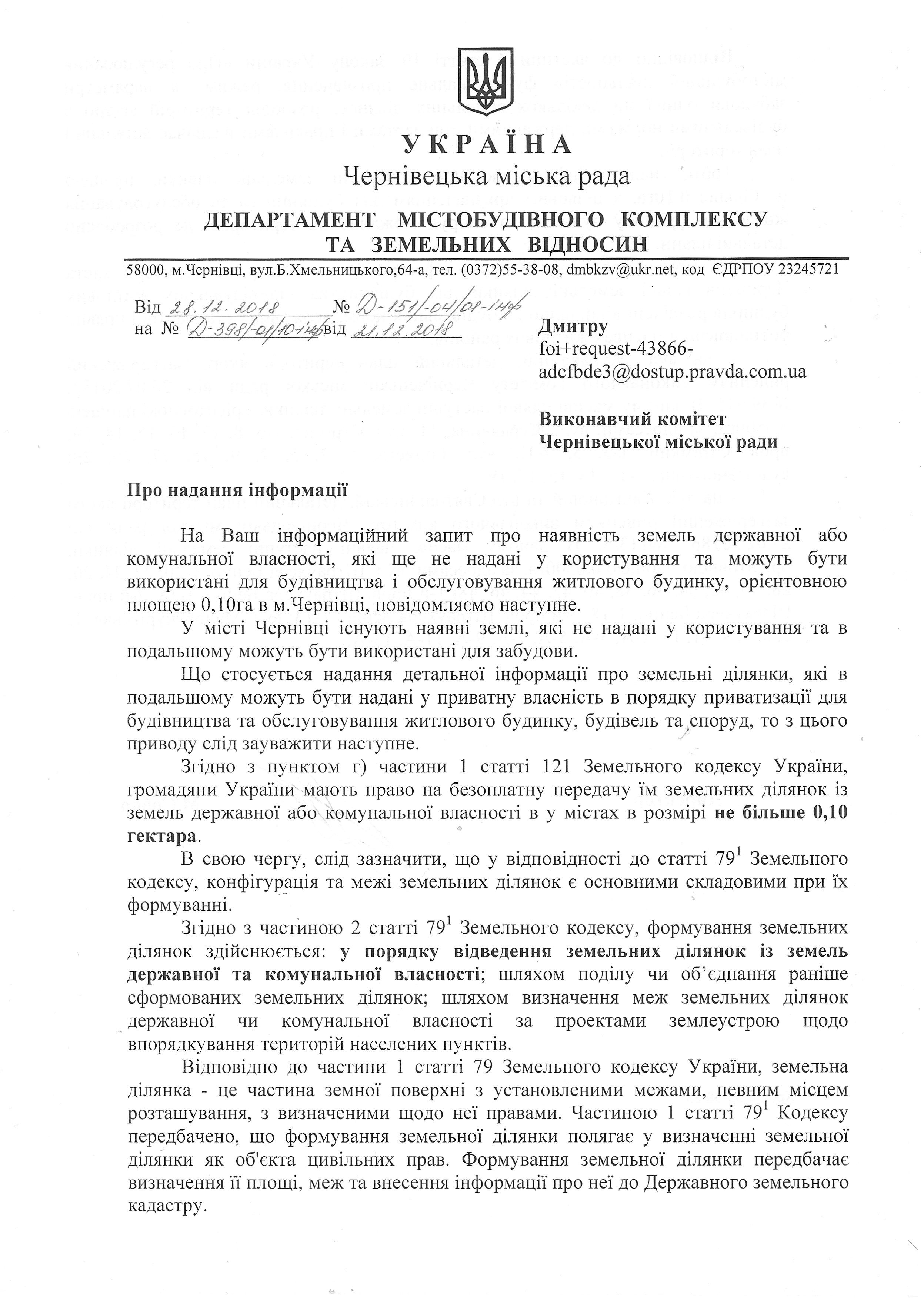 надати необхідну для безоплатної передачі землі інформацію про наявність земель державної та/або комунальної власності, які ще не надані у користування та можуть бути використані для будівництва і обслуговування жилого будинку, орієнтовною площею 0,10 гектара в Чернівецькій області, м. Чернівці