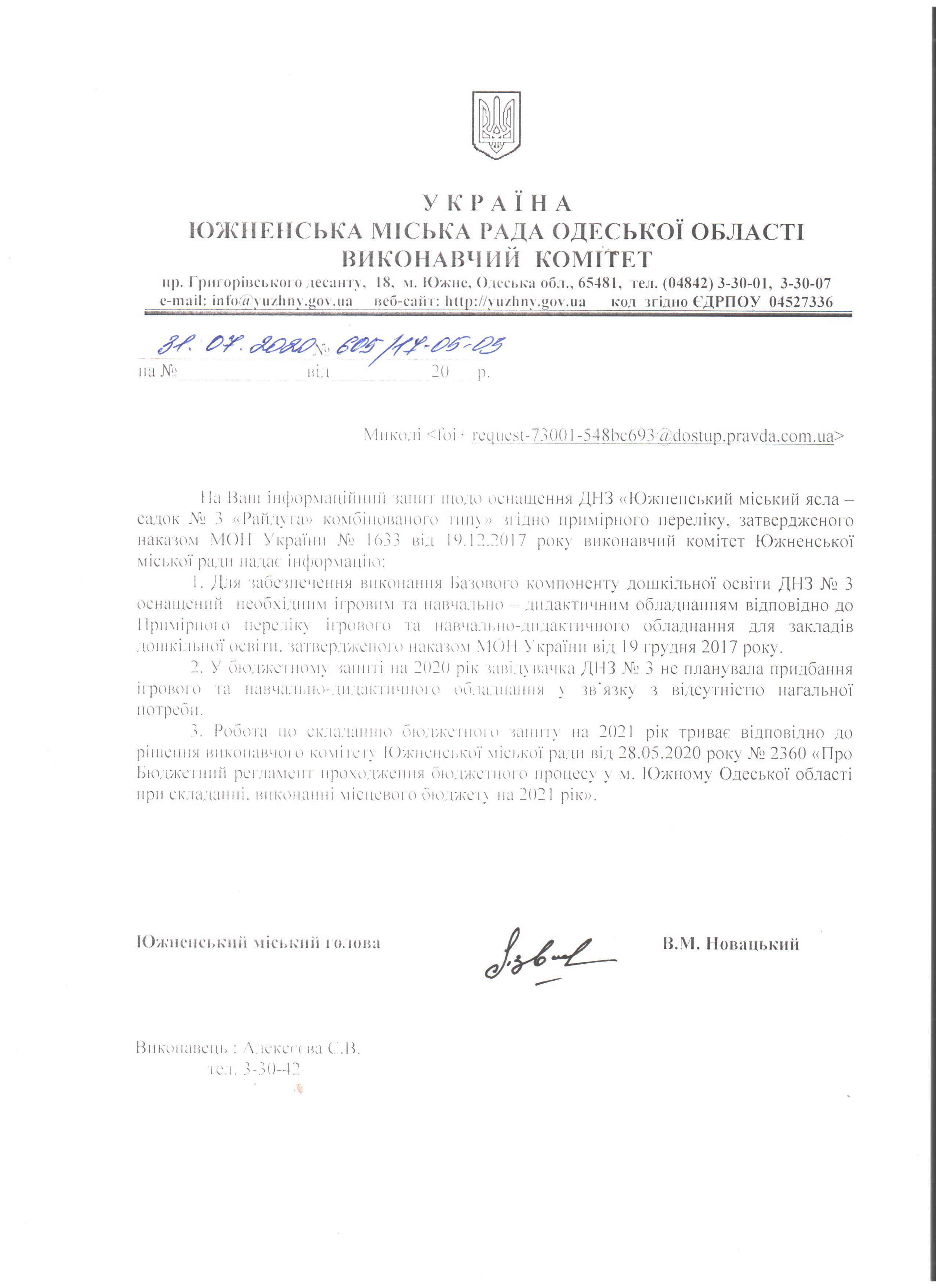 Щодо оснащення ДНЗ "Южненський міський ясла-садок №3 "Райдуга" комбінованого типу" згідно примірного переліку до наказу МОН №1633 від 19.12.2017